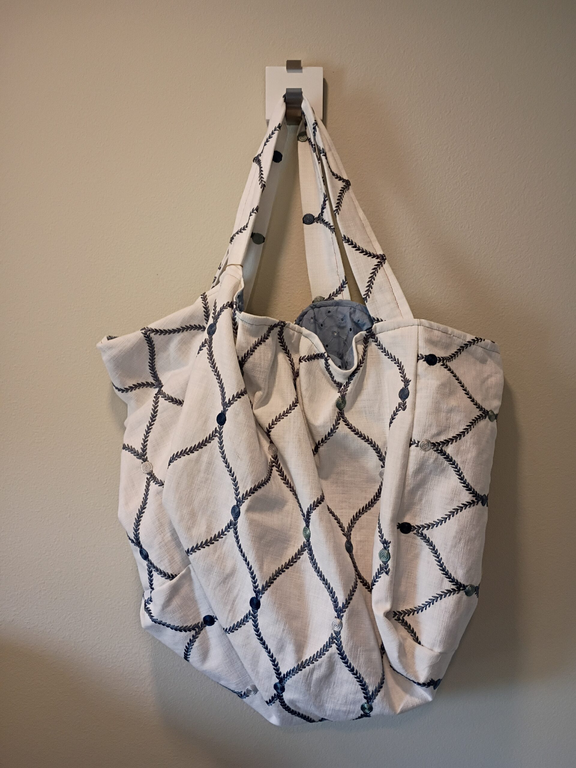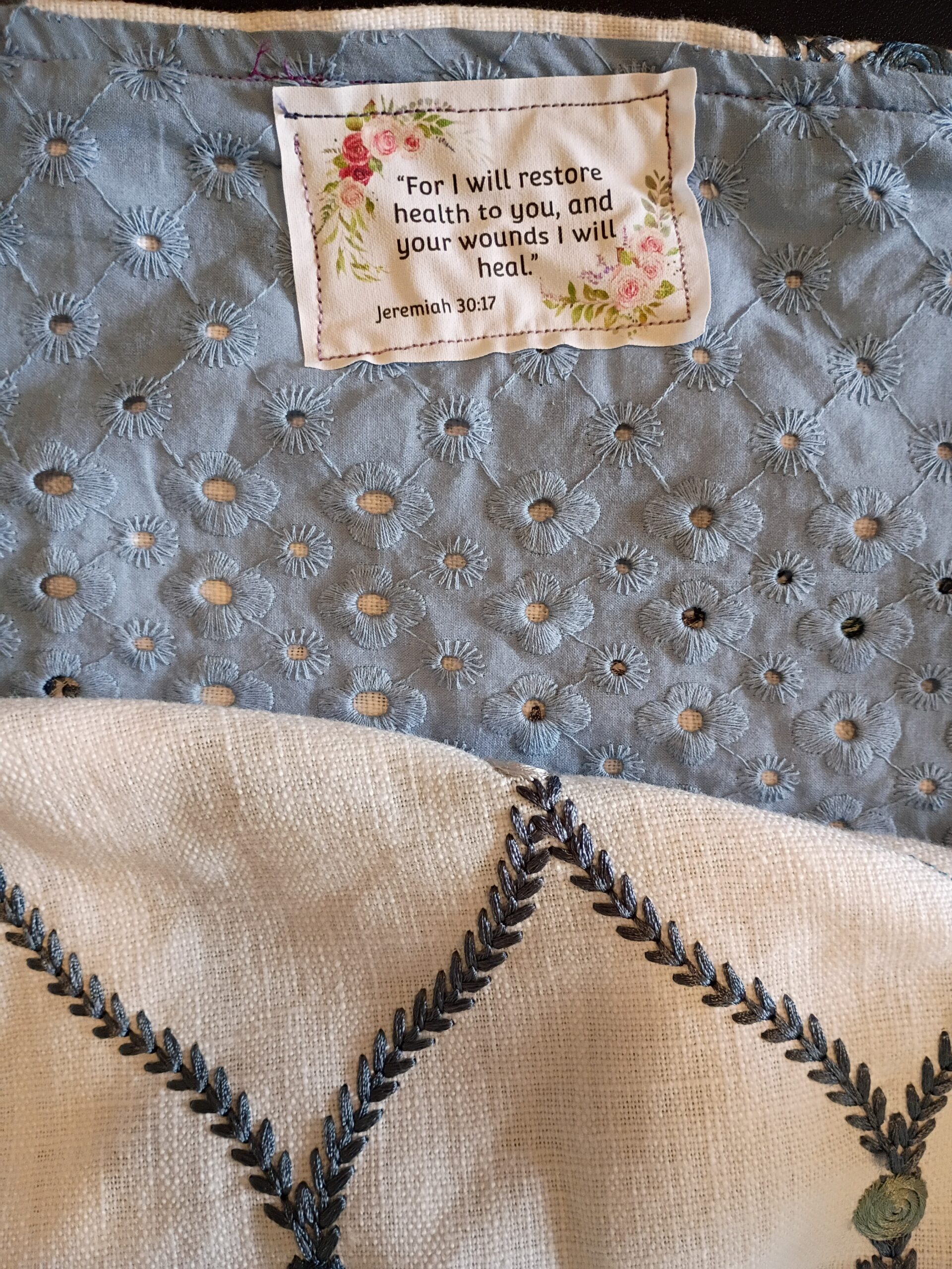 Description: White fabric with blue embroidered pattern, with periwinkle blue eyelet fabric on the inside. One of a kind!