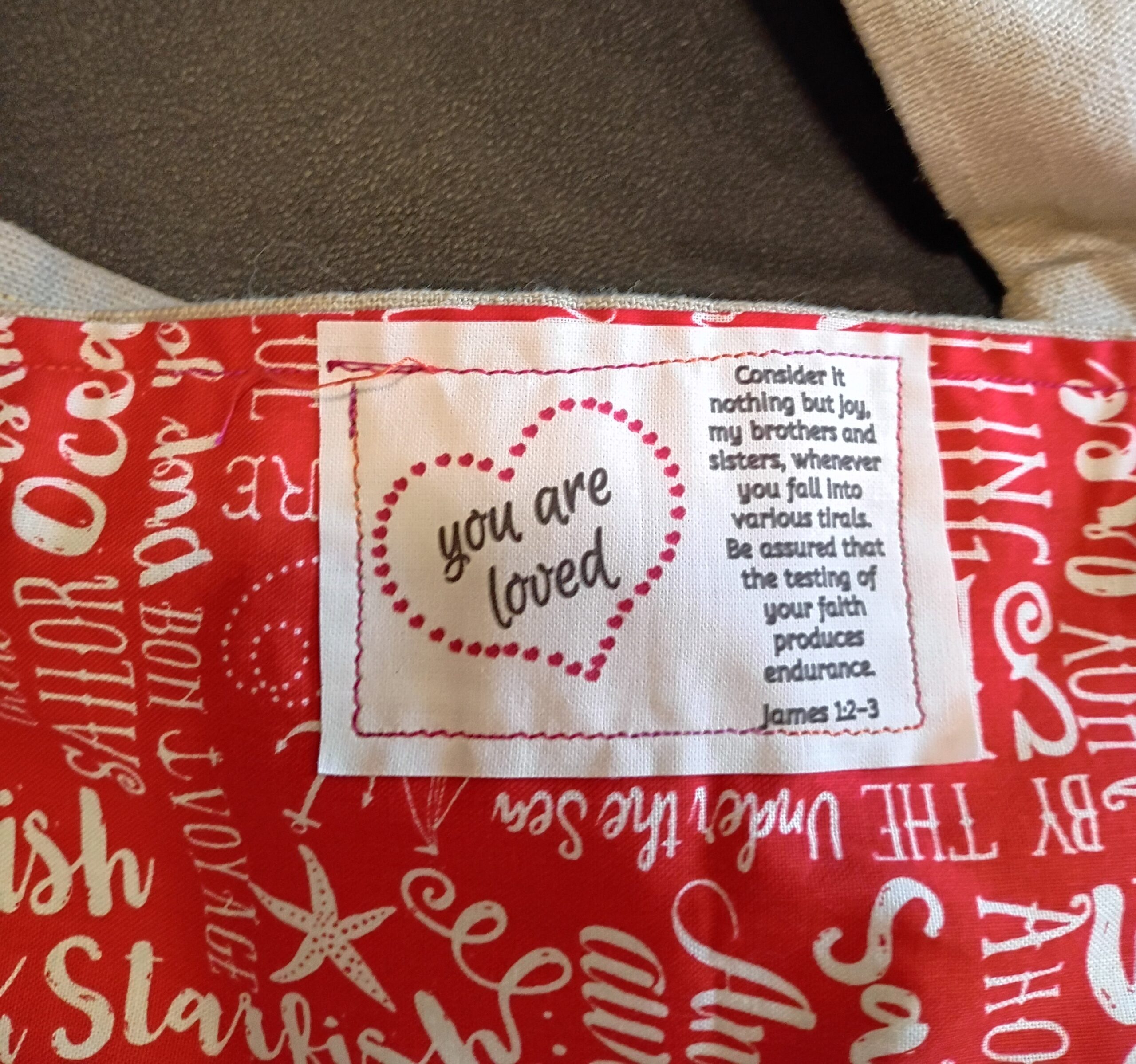 Description: White “under the sea” words on a red background, with tan linen fabric on the inside. Can be used either way; it’s reversible. One of a kind!