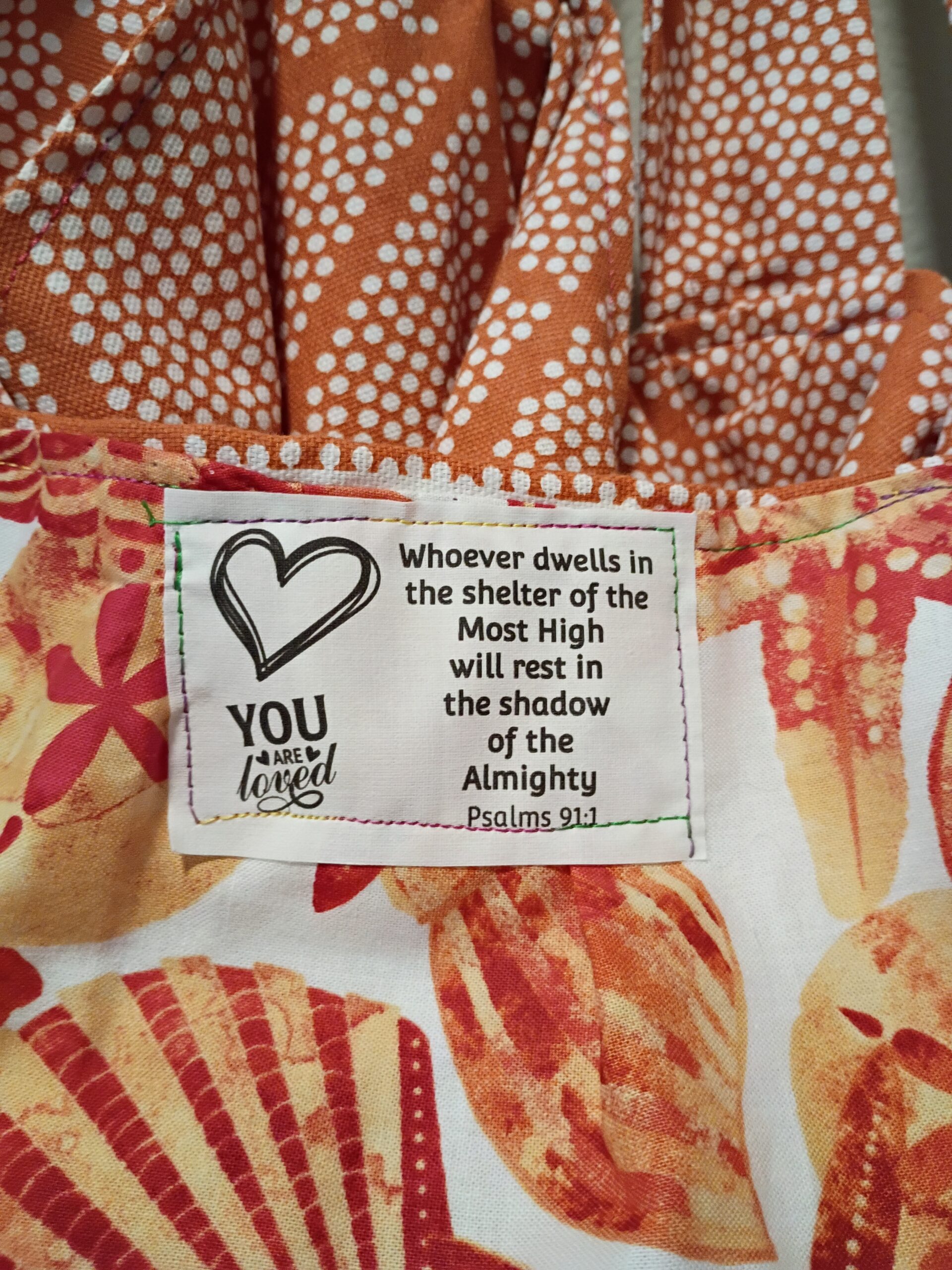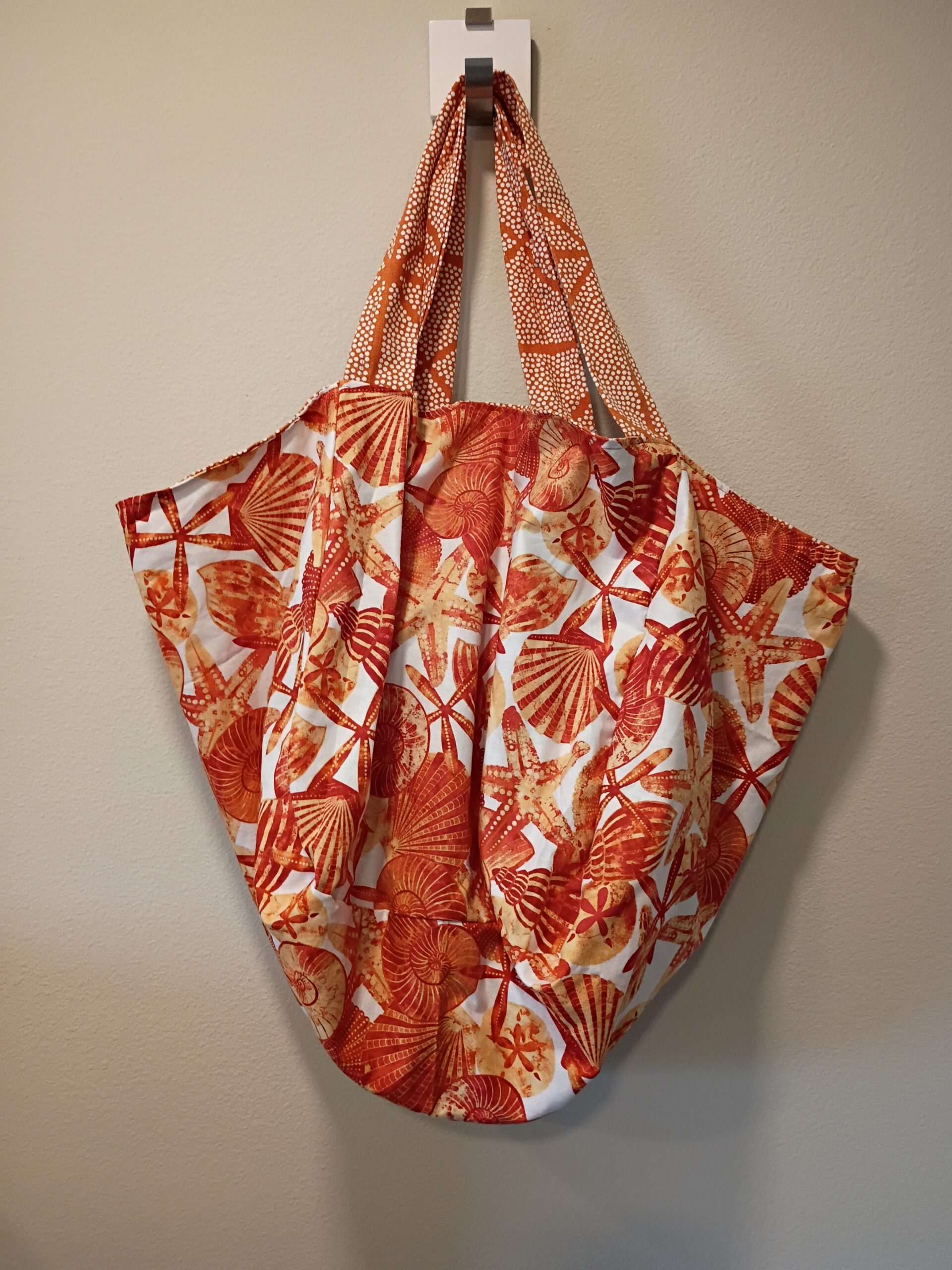 Description: Orange star fish and shells, with orange polka dot and stripe pattern on the inside. One of a kind!