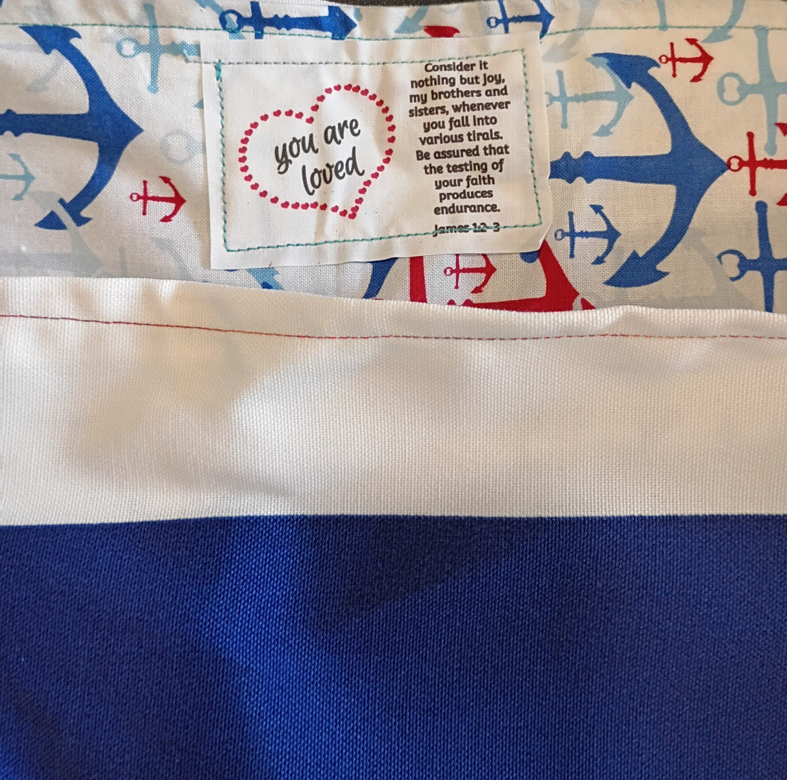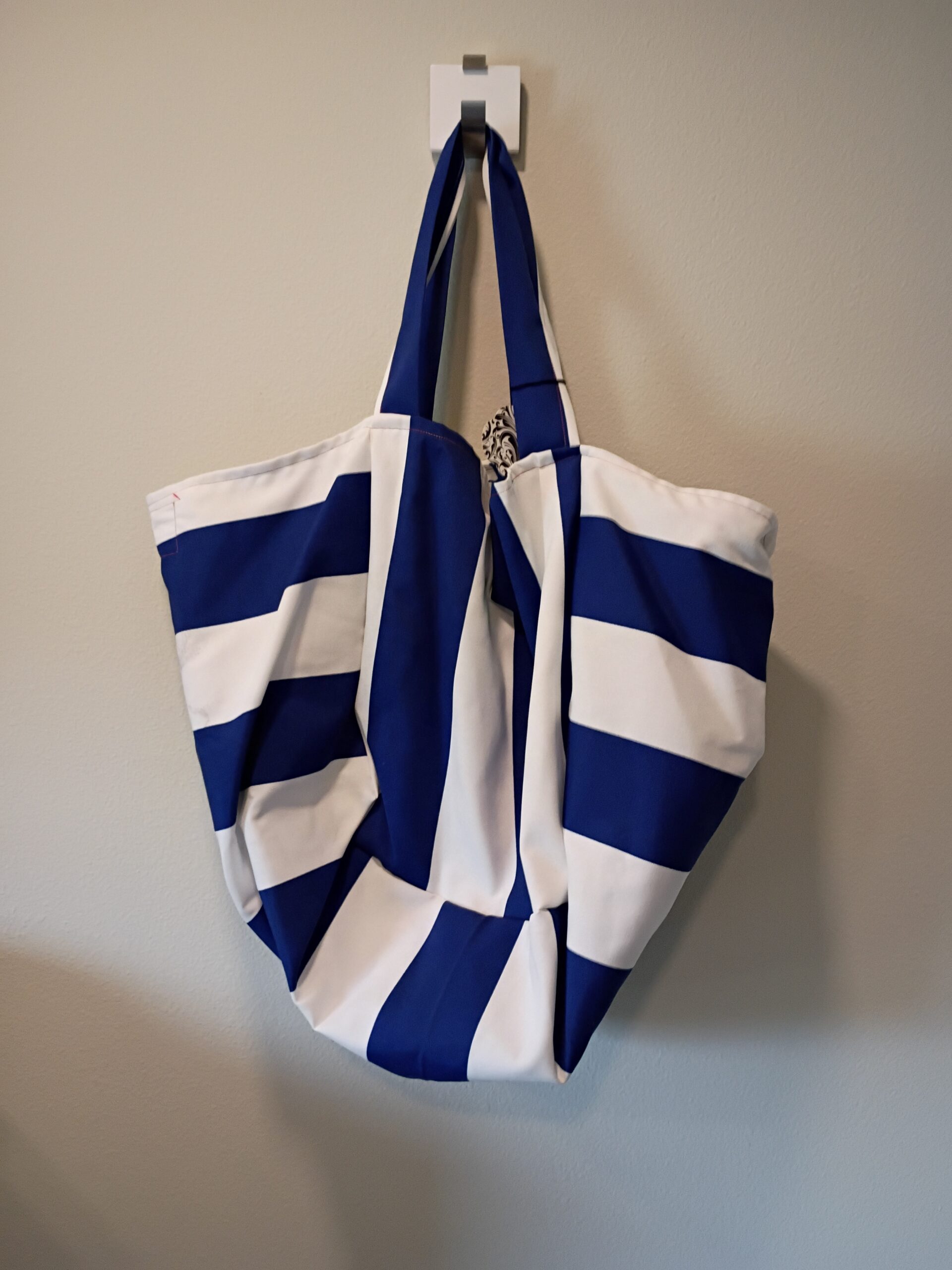 Description: Navy blue and white thick stripes, with blue and red anchors on the inside. Reversible. One of a kind!