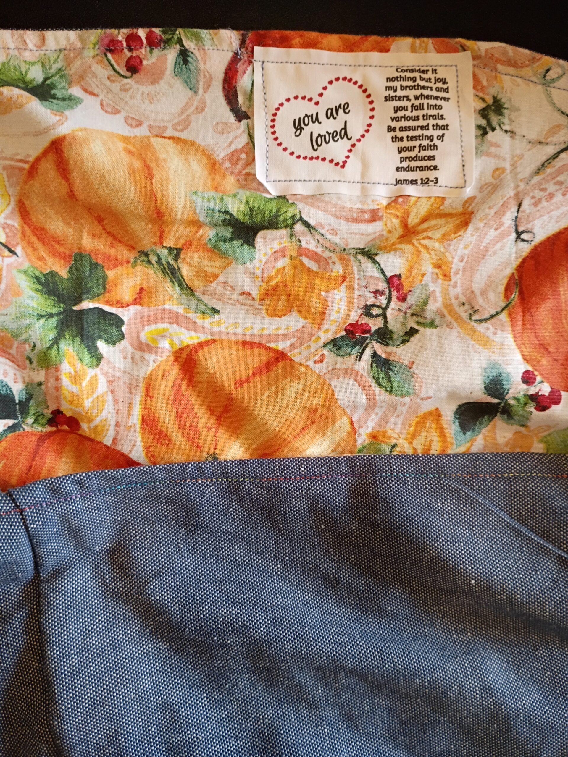 Description: Stretch denim fabric, with white and orange pumpkin pattern on the inside. One of a kind!