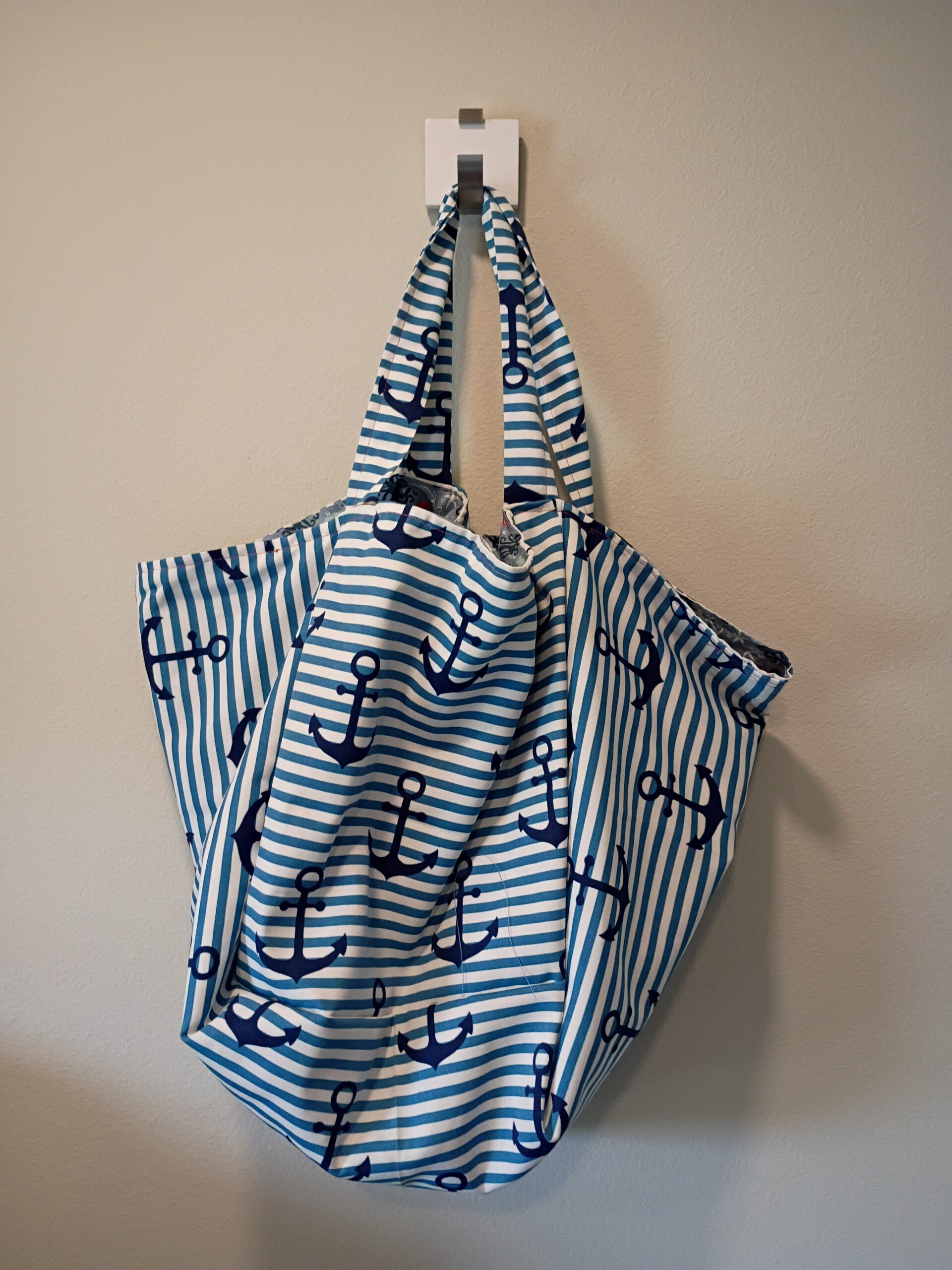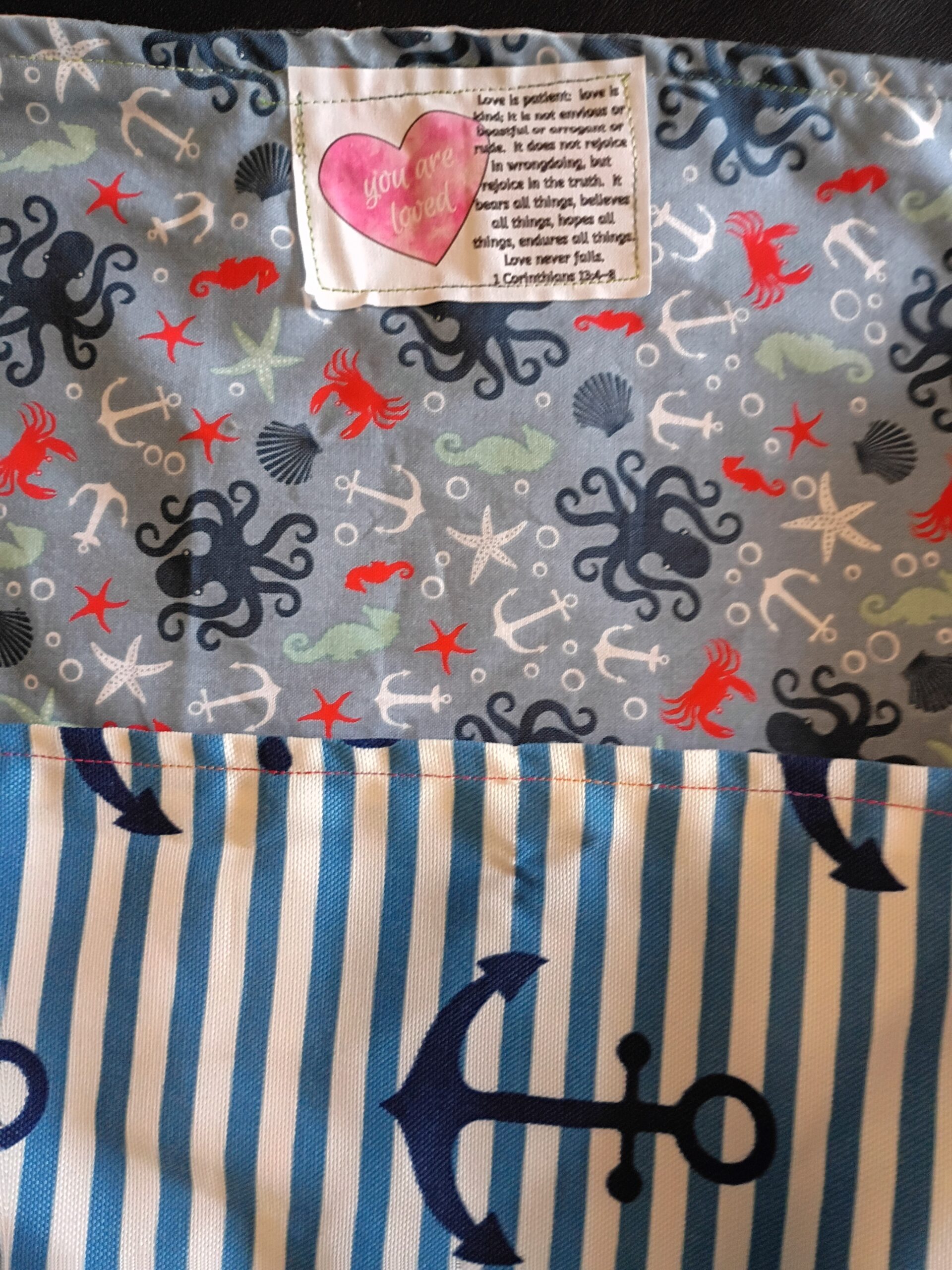 Description: Blue stripes with navy blue anchors, with octopuses and red starfish on the inside. Reversible. One of a kind!