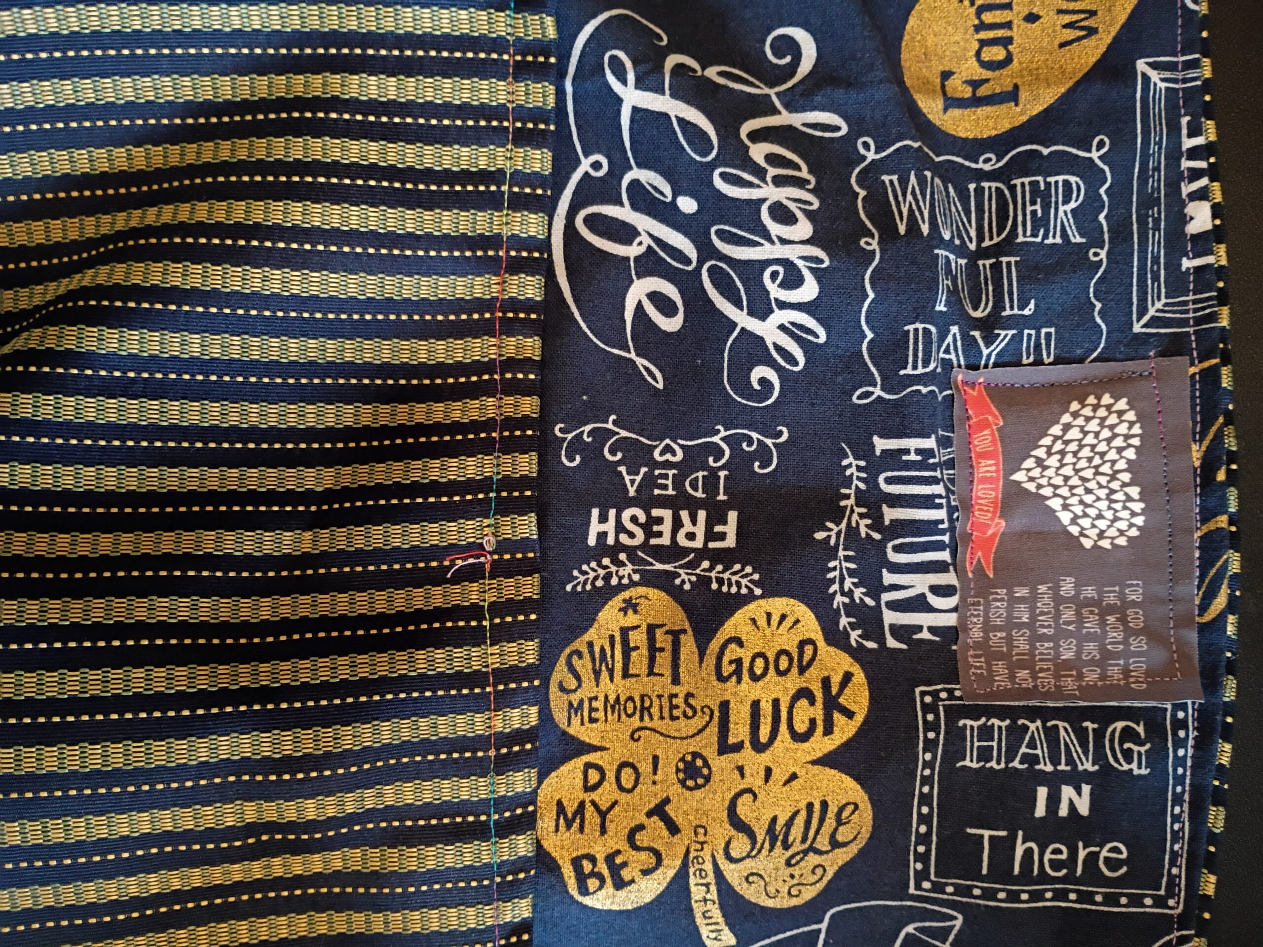 Description: Navy blue and gold stripes, with art on the inside. Reversible. One of a kind!
