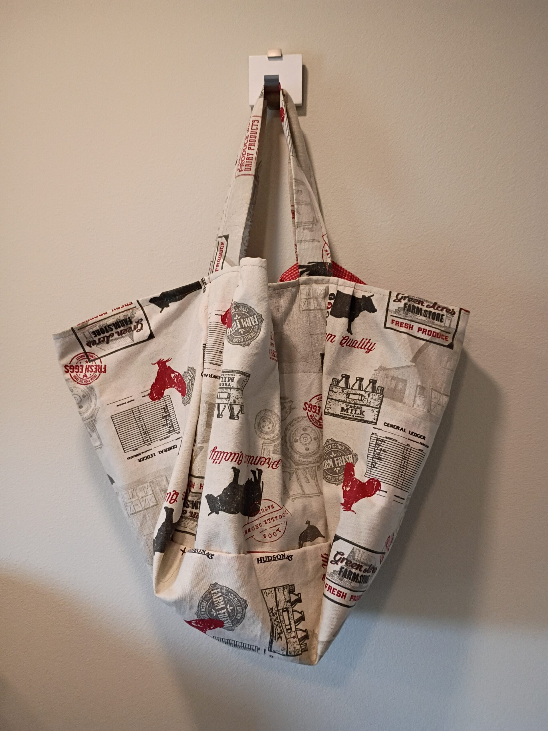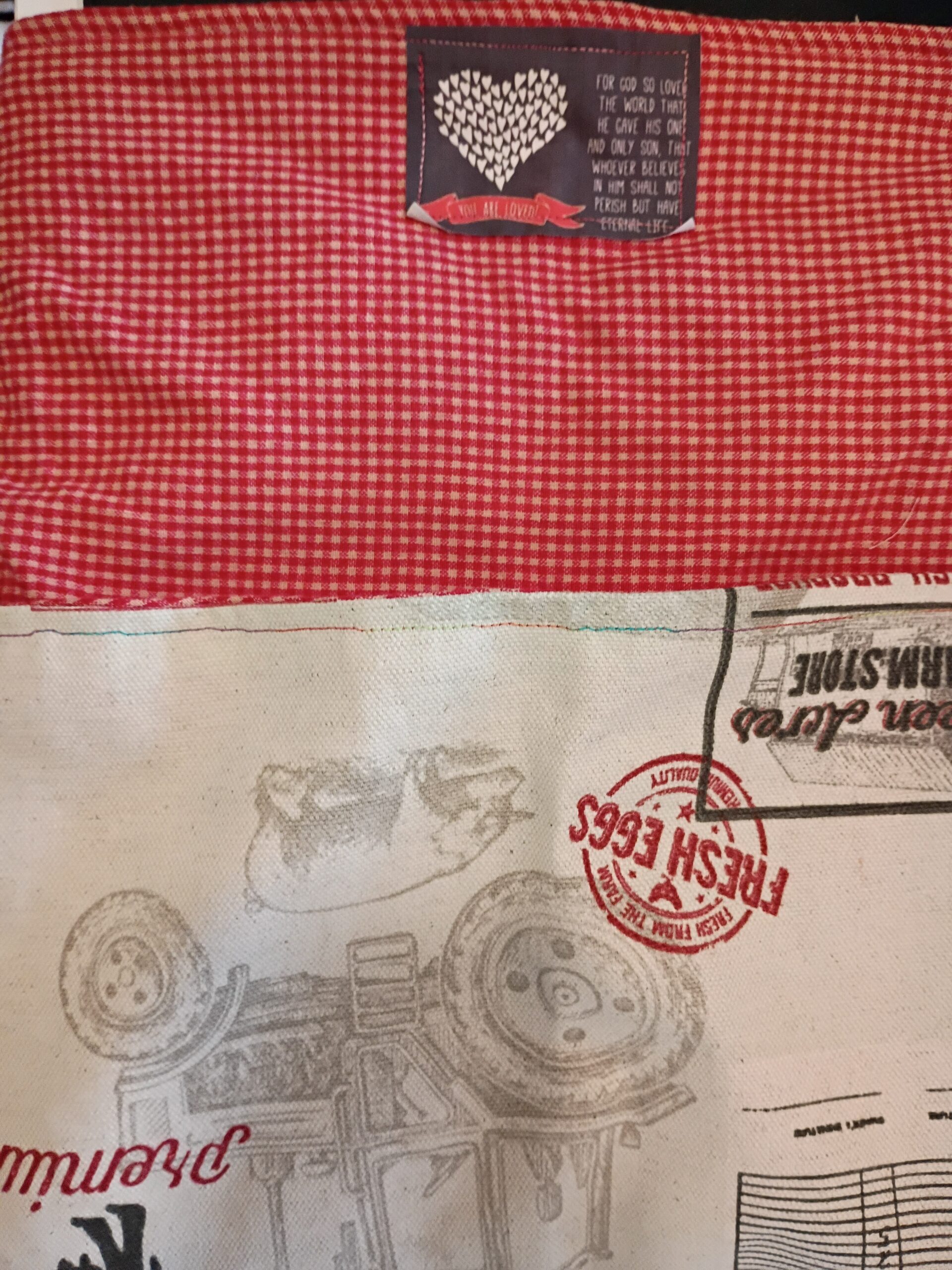 Description: Farm print with red checks on the inside. Reversible. One of a kind!