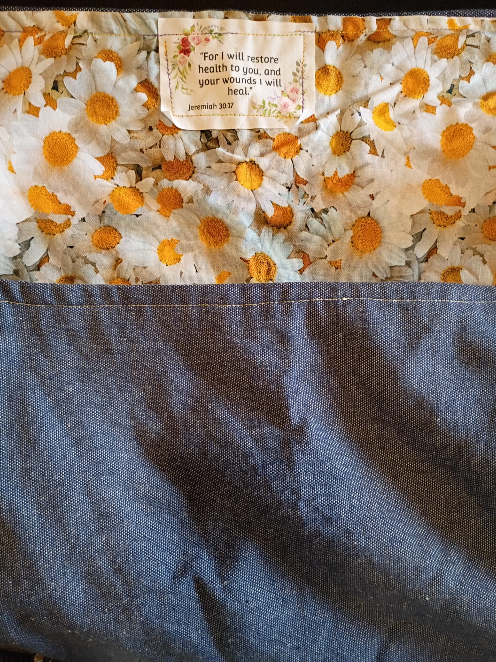 Description: Stretch-jean fabric with little daisies. Reversible. One of a kind!