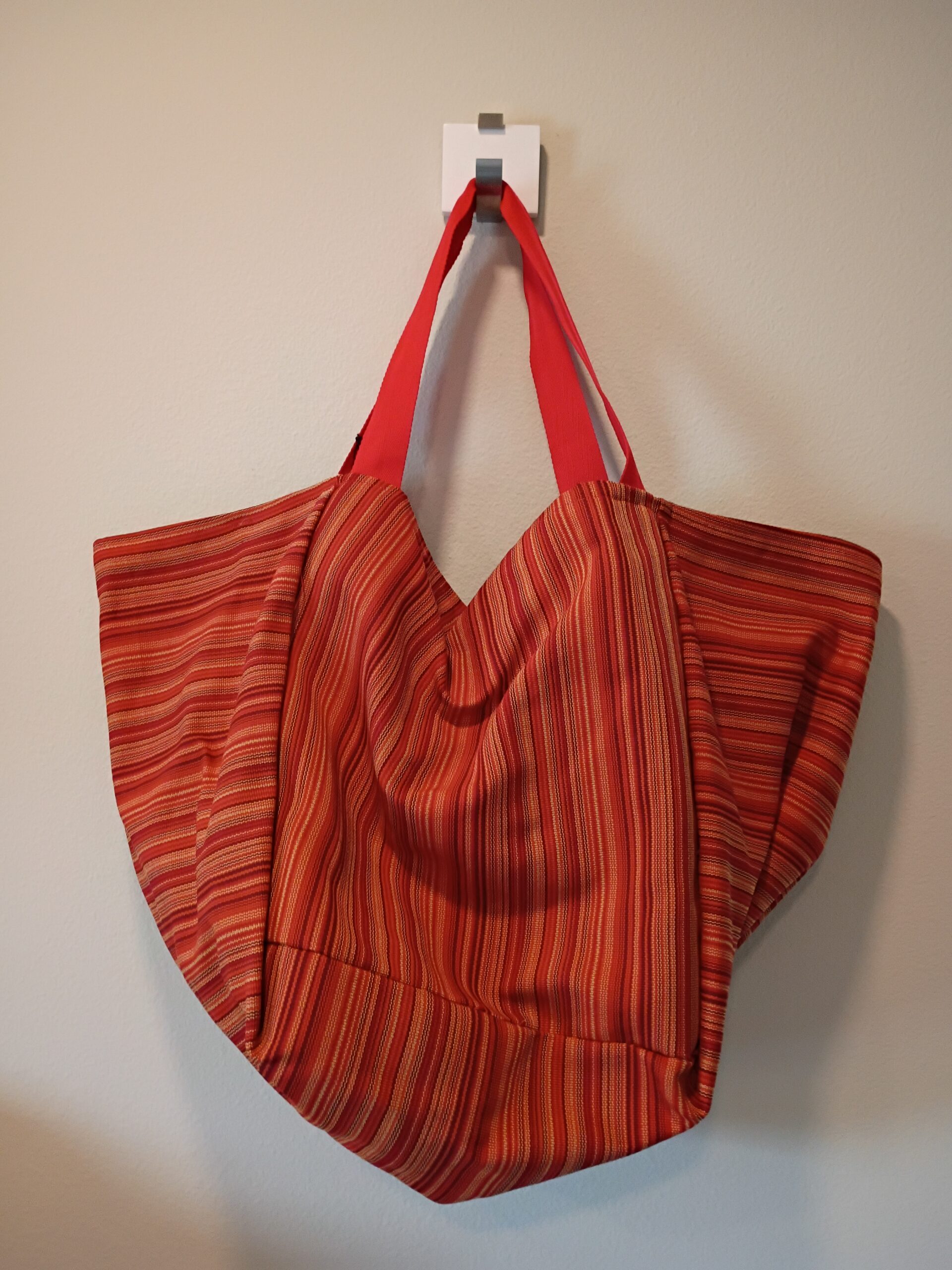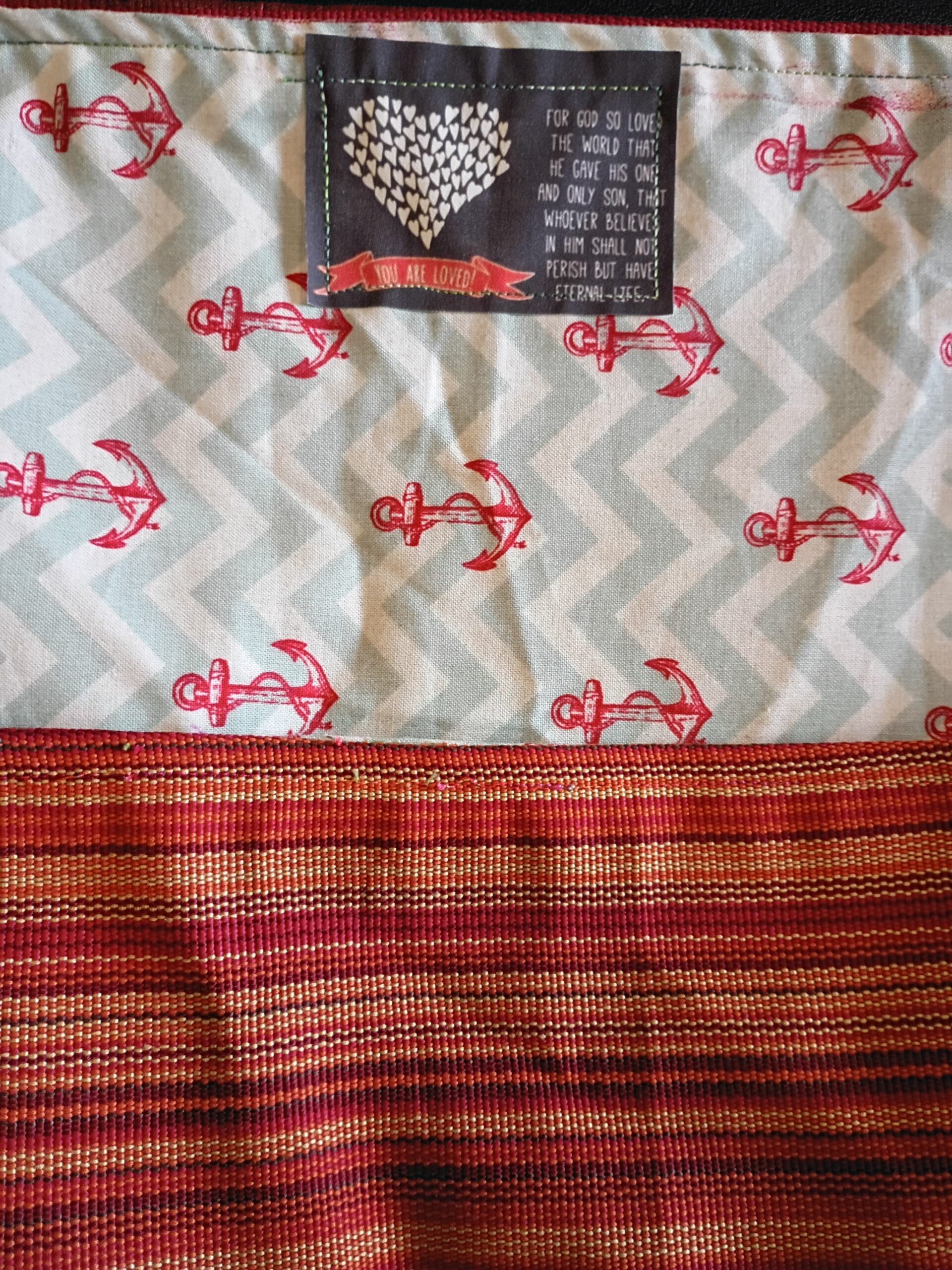 Description: Red, Orange, and White thin striped pattern, with striped blue anchor fabric on the inside. One of a kind!